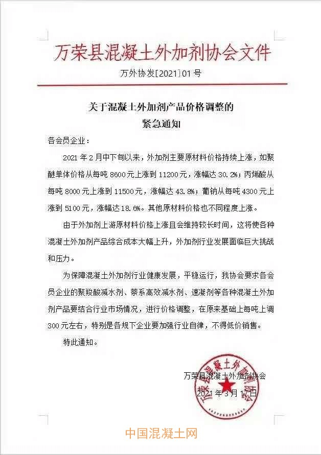 2021年年初,國際原油一路猛漲,短短4個月,其價格增長了35%左右,國內(nèi)化工產(chǎn)品價格持續(xù)飆升,以聚醚、丙烯酸和工業(yè)萘相關(guān)產(chǎn)品等為例的國內(nèi)減水劑主要原材料價格均出現(xiàn)明顯漲幅,近期,多個混凝土外加劑協(xié)會結(jié)合行業(yè)市場情況,進(jìn)行價格調(diào)整,發(fā)布漲價通知。